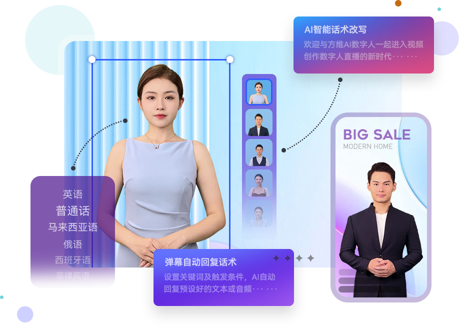 AI數(shù)字人定制 / 數(shù)字人直播 / AI短視頻生產(chǎn) / AI語(yǔ)音合成 / 場(chǎng)景化模板 / 智能腳本
